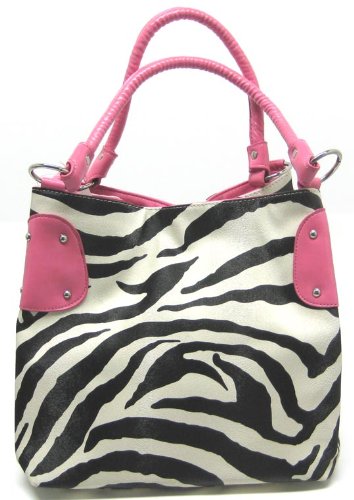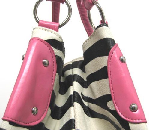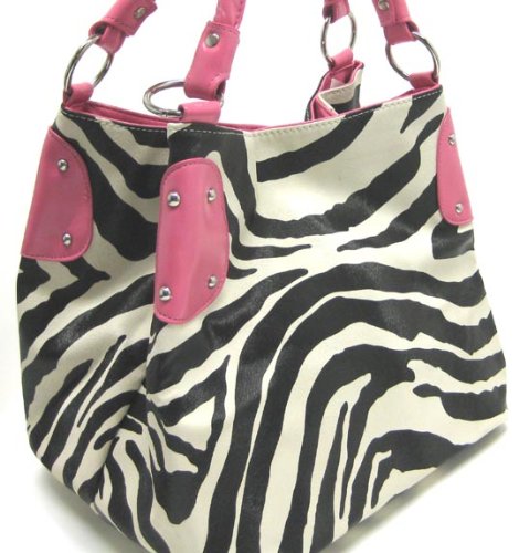 This beautiful zebra striped handbag is the perfect accompaniment for your daily travels, or for a night on the town. Made of synthetic leather, with an animal skin texture, the bag has a chrome hardware and studs, and has pink vinyl accent panels. The nylon lined interior has 2 small pockets and a zipper pouch to keep your belongings in place. The bag measures 11 inches tall, 11 inches wide, and 9 inches deep. The pink padded handles have a 9 inch drop.This bag is BRAND NEW, never used. These won't be around long, so don't delay! Get yours now!
