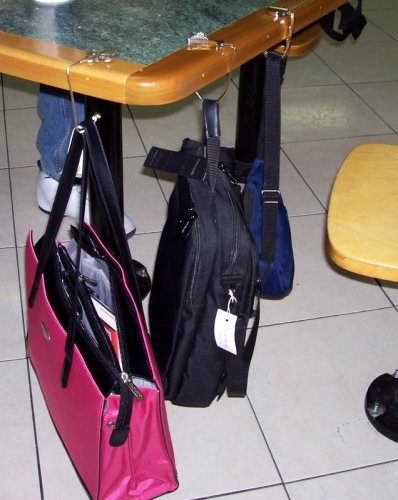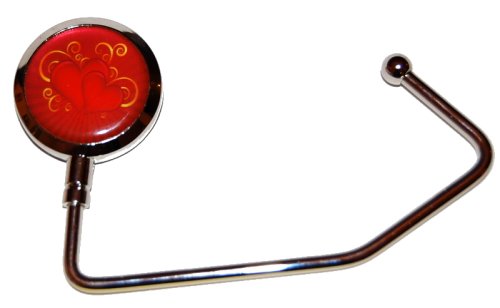 Keep your bag off the dirty floor and in sight. Our convenient purse hooks let you hang your handbag right next to you. This purse hanger features a a two hearts on a deep red background and will hold bags up to 20 pounds. The sturdy, simple design works for a wide assortment of bags. The hook has a silver tone finish.