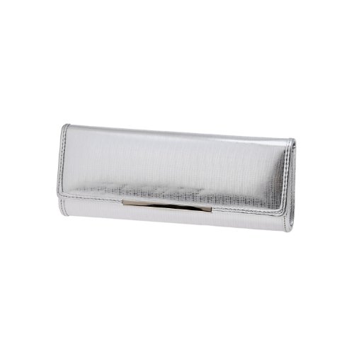 The perfect match for your favorite little black dress? This lengthened and textured evening clutch, equipped with fold-over flap closure, slender metallic trim, and tone-on-tone stitching and piping detail. Also with practical compartments on the inside.