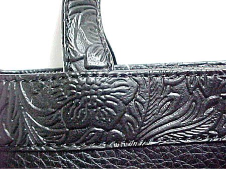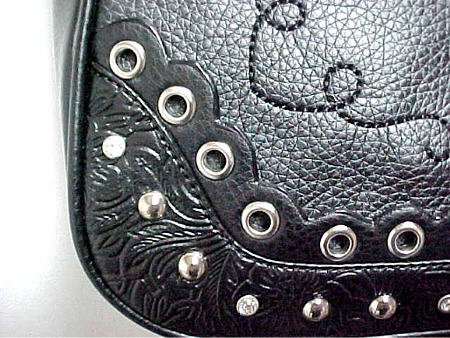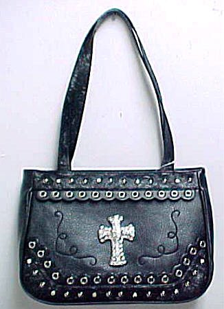 This beautiful Gothic style vinyl handbag features chrome studded tooled black vinyl accents and a rhinestone crystal encrusted Gothic cross on the front, in the center. The handbag has a top zipper to keep all of your belongings inside. The nylon interior lining features a zipper pocket and 2 small pockets to store important items. The tooled 3/4 inch straps have a 10 inch drop. The bag measures 8 inches tall, 11 1/2 inches wide and 3 1/2 inches wide.This gorgeous handbag is perfect for everyday use, or for a night on the town. It's a great present for yourself or friends. These won't last long, so get yours now!!