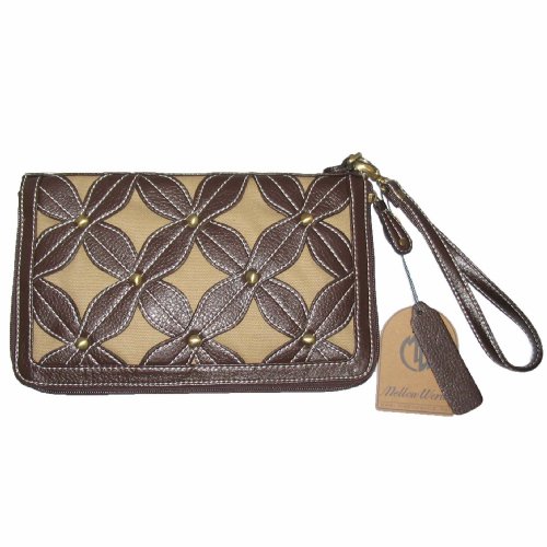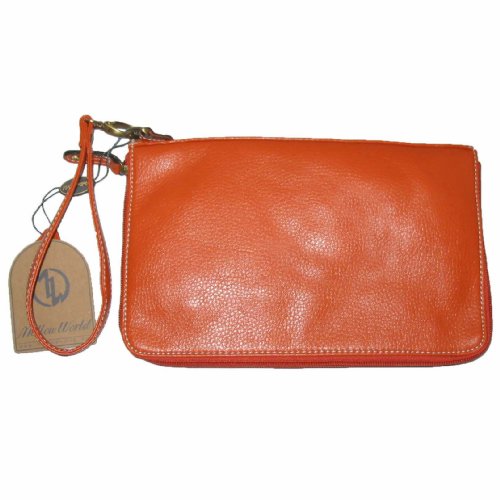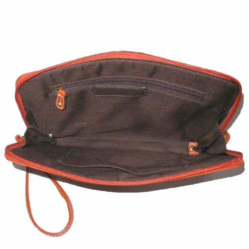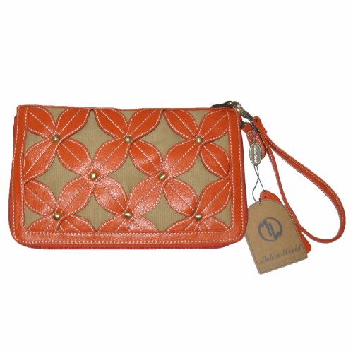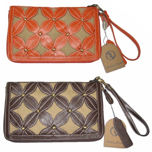 Classic style you can suit to the occasion. Made of soft textured faux Rococo leather. Comes in Orange and Brown. Front of clutch features daisy cut-outs over top a tan ramie background. Great for everyday use. Matches our large Rococo bag. Brass-tone hardware and studs. Single detachable carrying handle. Zip around closure. Fully lined interior with zip wall convenience pocket and slip pouch. 7" Handle strap L 10 * H 6.5 * W 1