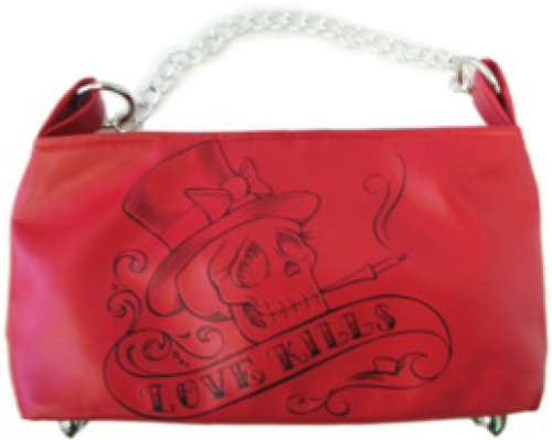 - Stylized Smoking Skull with Top Hot and 'Love Kills' Banner- Zipper Closure, Metal Stud Feet, Chain Handle