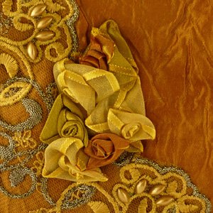 This elegant vintage style purse is adorned with hand sewn beads, organza ribbon rossetts and embroidery on front side.Approx. 5"W x6"H, fringe tassel is 4"LChain measures approx. 46"L.It doesn't hold much, but enough for lipsticks, keys and an ID.Satin lining inside.