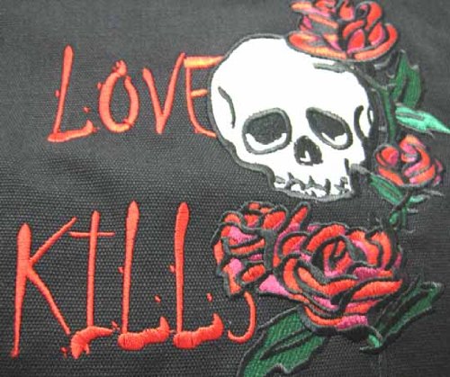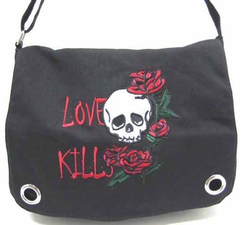 Buy Embroidered Love Kills Skull Black Canvas Messenger Bag Now