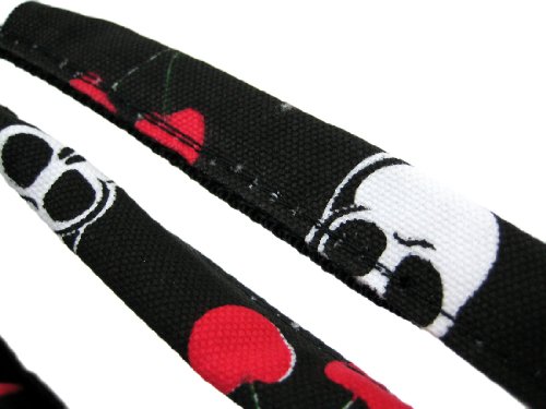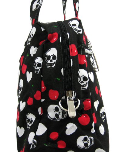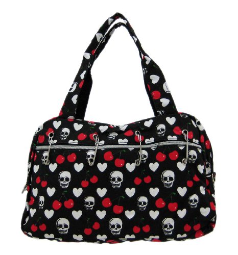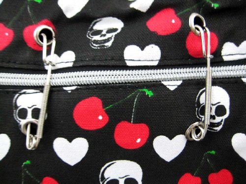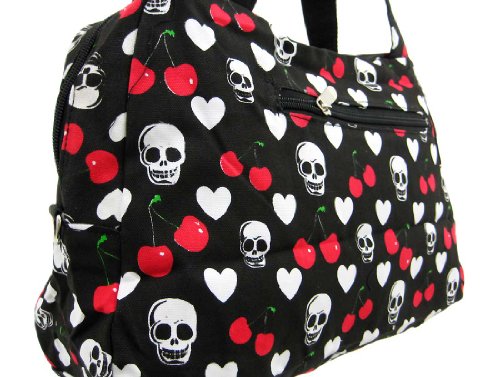 This ultra-cool black handbag is great to carry on a night on the town. Made of heavy nylon, it features a red, white and green print of skulls, hearts and cherries. The bag has a zipper pocket on the back side, and the front side is accented with chrome plated industrial looking clips for a touch of attitude. The interior lining is made of polyester, and features a zipper pouch. The purse measures 15 inches wide, 9 1/2 inches tall and 5 inches deep.The matching twin straps have a 7 inch drop. It comes with a removable nylon adjustable shoulder strap.
